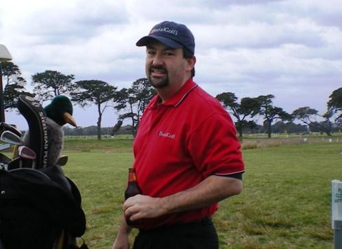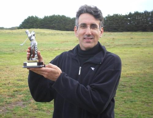 Seve (aka Michael Mileo) proudly displays his winners trophy after taking the bikies by a single point in the 3rd Bushranger Golf Handicap Day held at The Creek Course at the 13th Beach Golf Links, Friday August 10, 2007.